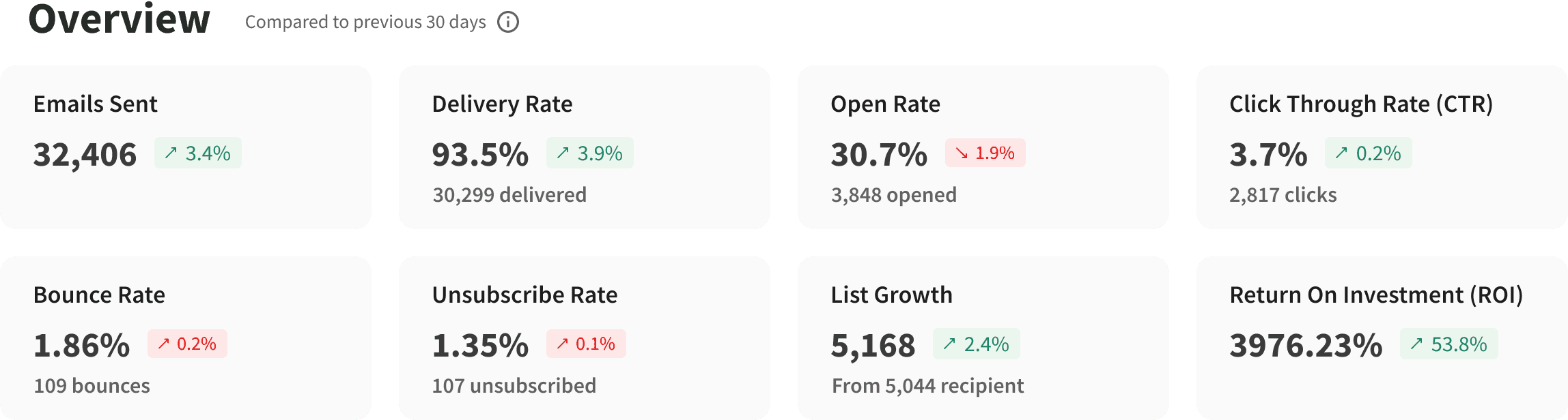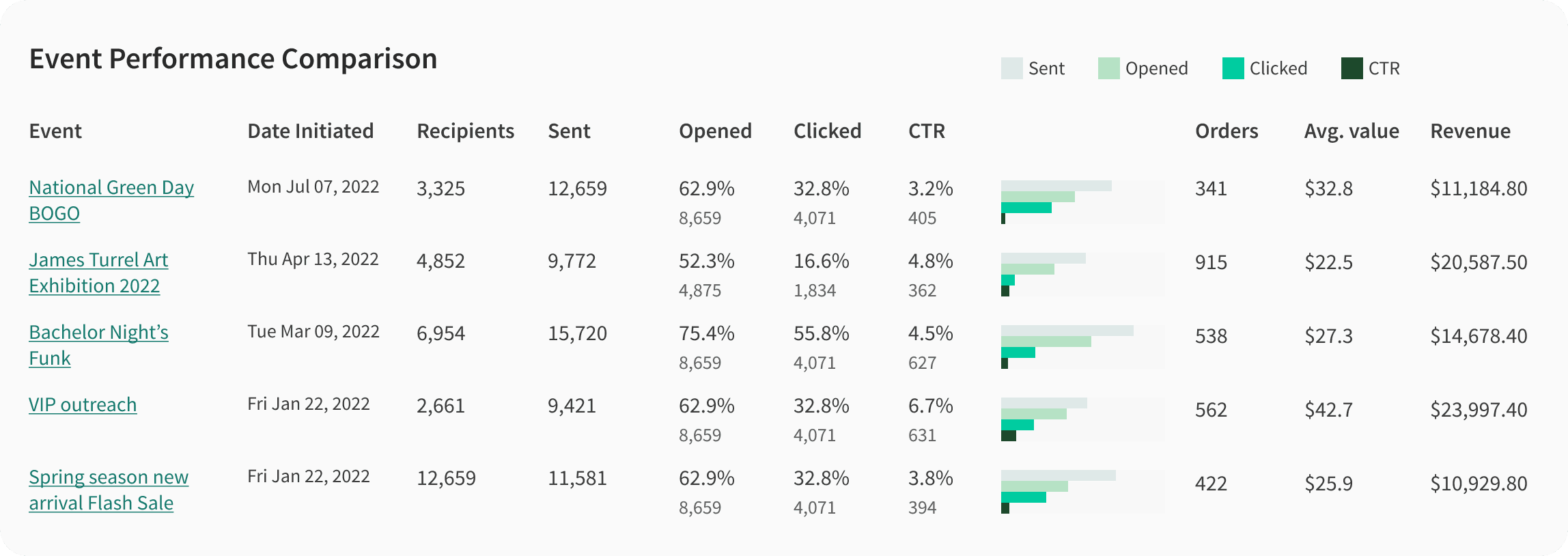 Integrated with the resesarch insights, we selected essential performance indicators to present, including delivery rate, open rate, and click-through rate.