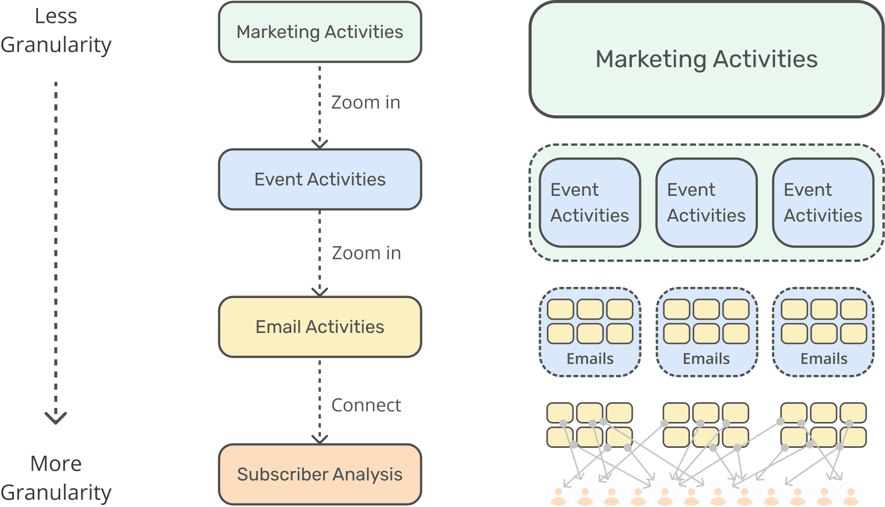 I created a granularity-based structure diagram, moving from broad marketing activities to specific email and subscriber analyses.